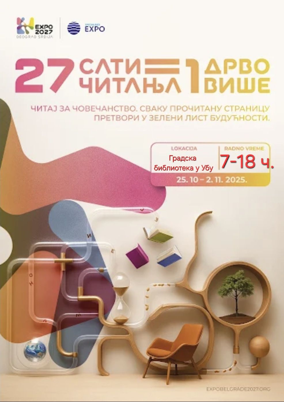 Уживајте у читању без мобилних телефона у нашој Библиотеци и заједно ћемо допринети да се за сваких 27 сати читања посади још једно дрво у Београду, током новембра месеца, а као симбол 2027. године када се одржава Експо.
