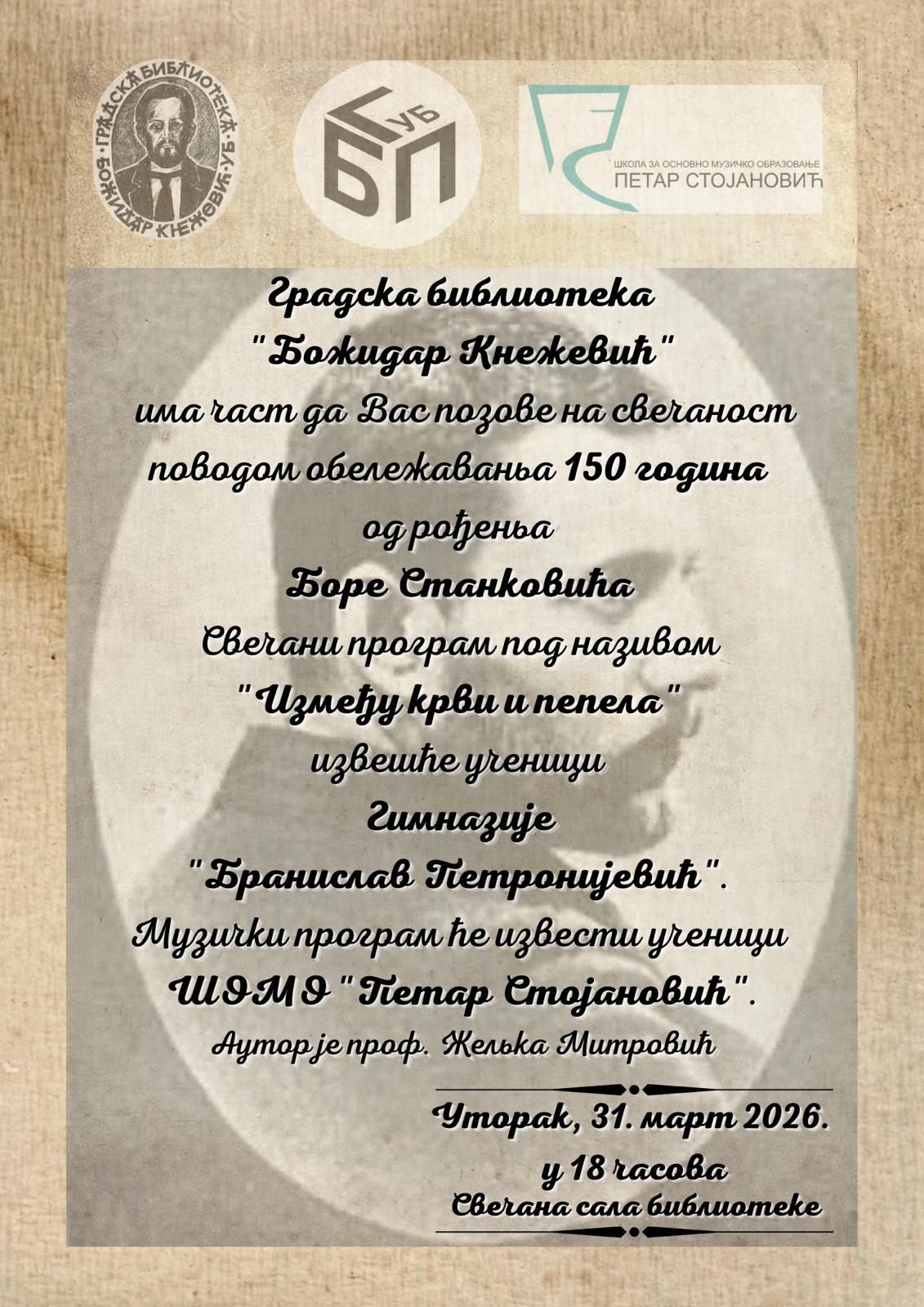 Позивамо вас на свечаност поводом обележавања 150 година од рођења великог српског писца Боре Станковића. Програм ће извести ученици Гимназије "Бранислав Петронијевић" и ШОМО "Петар Стојановић".